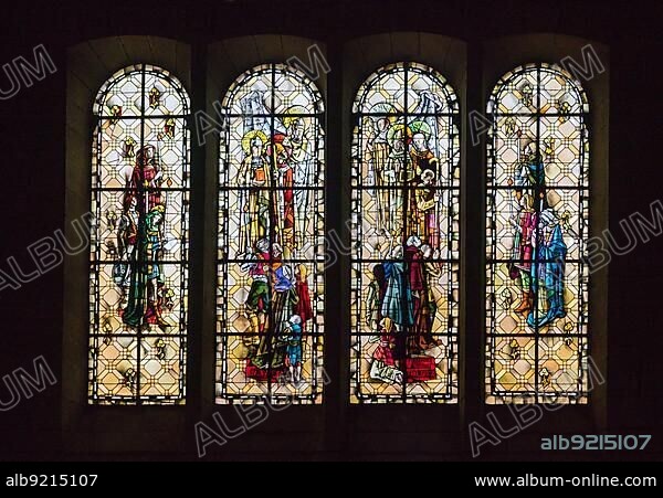 A detailed view of stained glass windows in the cathedral of Saint Malo in Brittany in France