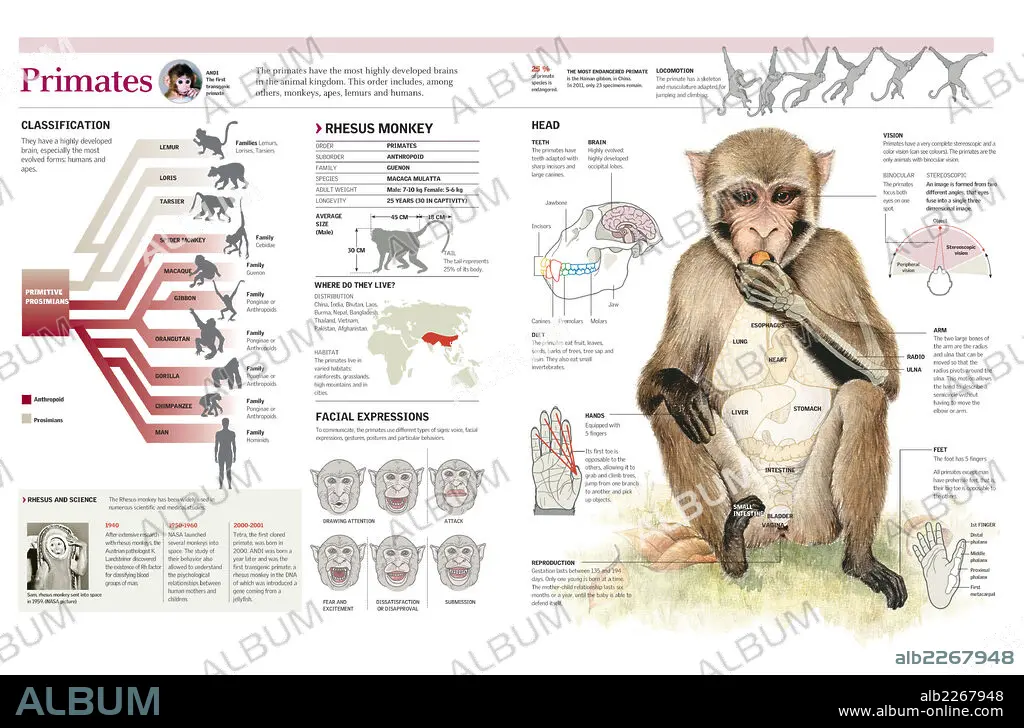 Infographics of the classification of primates and their anatomical features focused on the rhesus monkey.