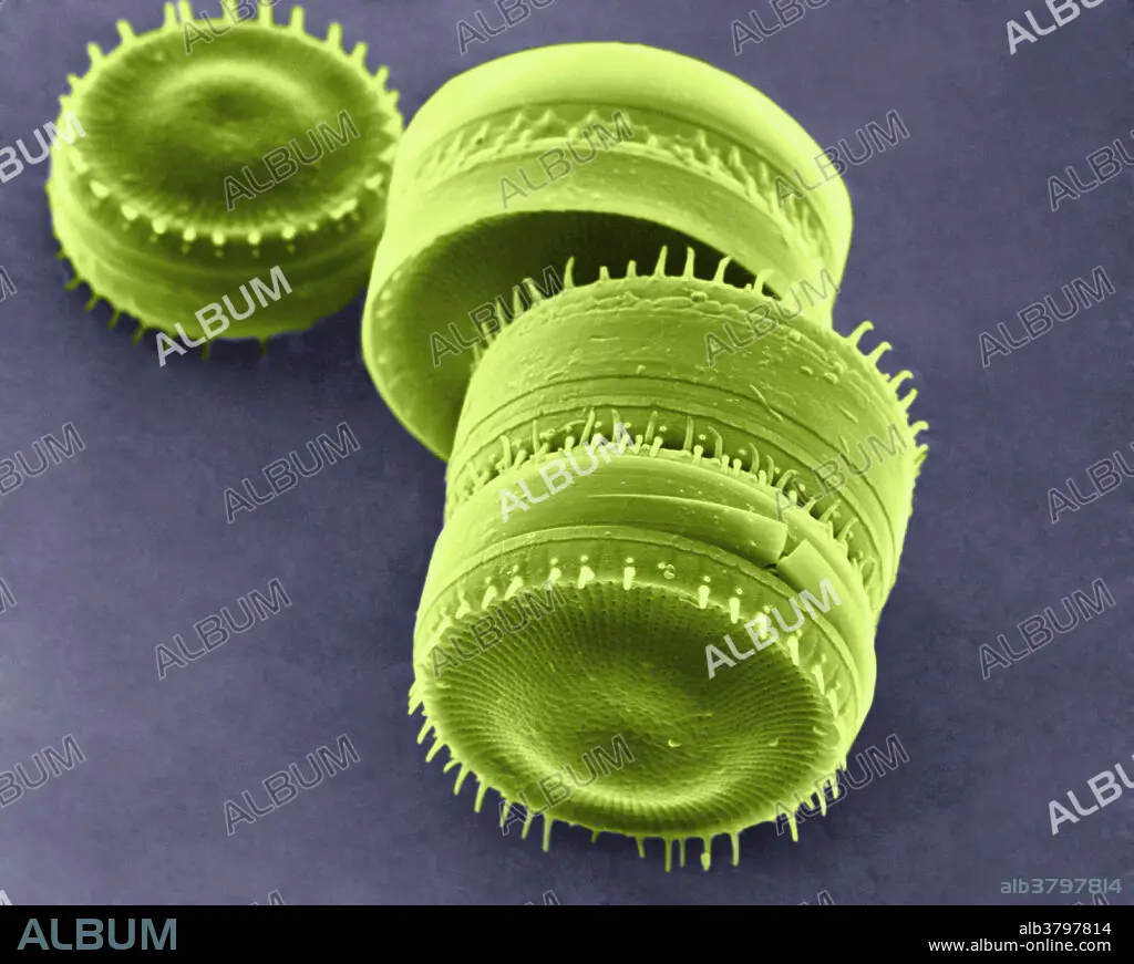 Caption: Colour-enhanced Scanning Electron Micrograph (SEM) of Stephanodiscus astraea, a species of centric diatom. The diatoms are a group of photosynthetic, single-celled algae containing about 10,000 species. They form an important part of the plankton at the base of the marine and freshwater food chains. The characteristic feature of diatoms is their intricately patterned, glass-like cell wall, or frustule. The frustule often has rows of tiny holes, known as striae. Magnification: 3000x.