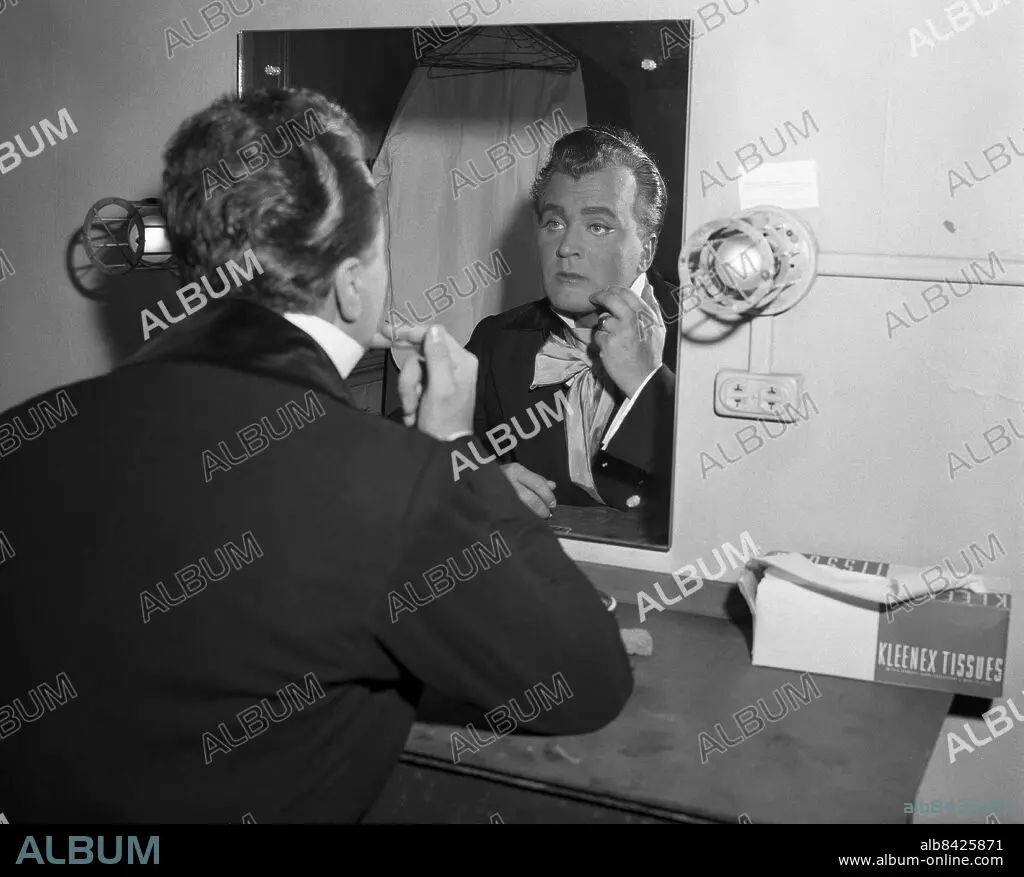 NEW YORK 1957-10-01. Operasångaren och tenoren Nicolai Gedda är sminkad inför sin roll som Faust i operan med samma namn på Metropolitanoperan.. Foto: TT Historical / kod 1900
