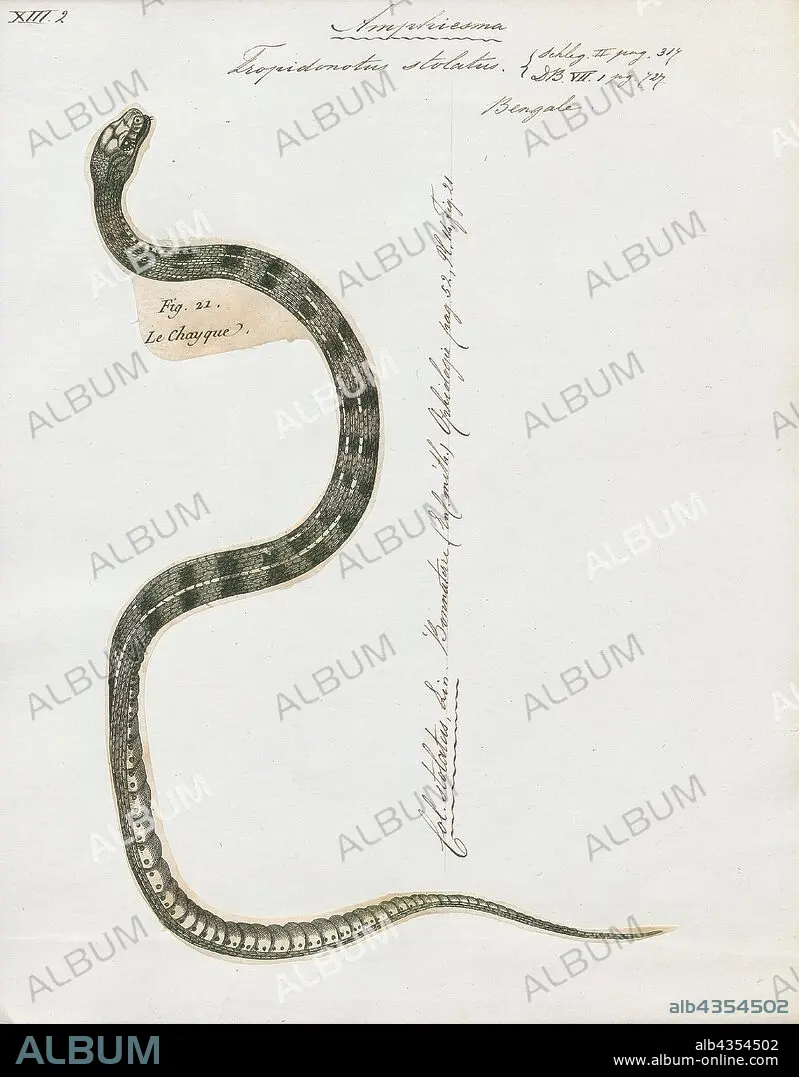 Caption: Tropidonotus stolatus, Print, The buff striped keelback (Amphiesma stolatum) is a species of nonvenomous colubrid snake found across Asia. It is the sole species of genus Amphiesma. It is a typically nonaggressive snake that feeds on frogs and toads. It belongs to the subfamily Natricinae, and is closely related to water snakes and grass snakes. It resembles an Asian version of the American garter snake. It is quite a common snake but is rarely seen., 1700-1880