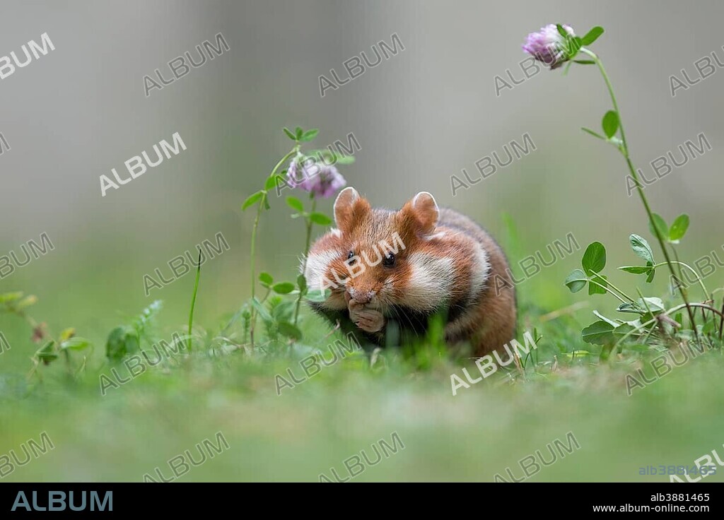 European hamster (Cricetus cricetus), young animal with full cheeks in meadow, Austria, Europe