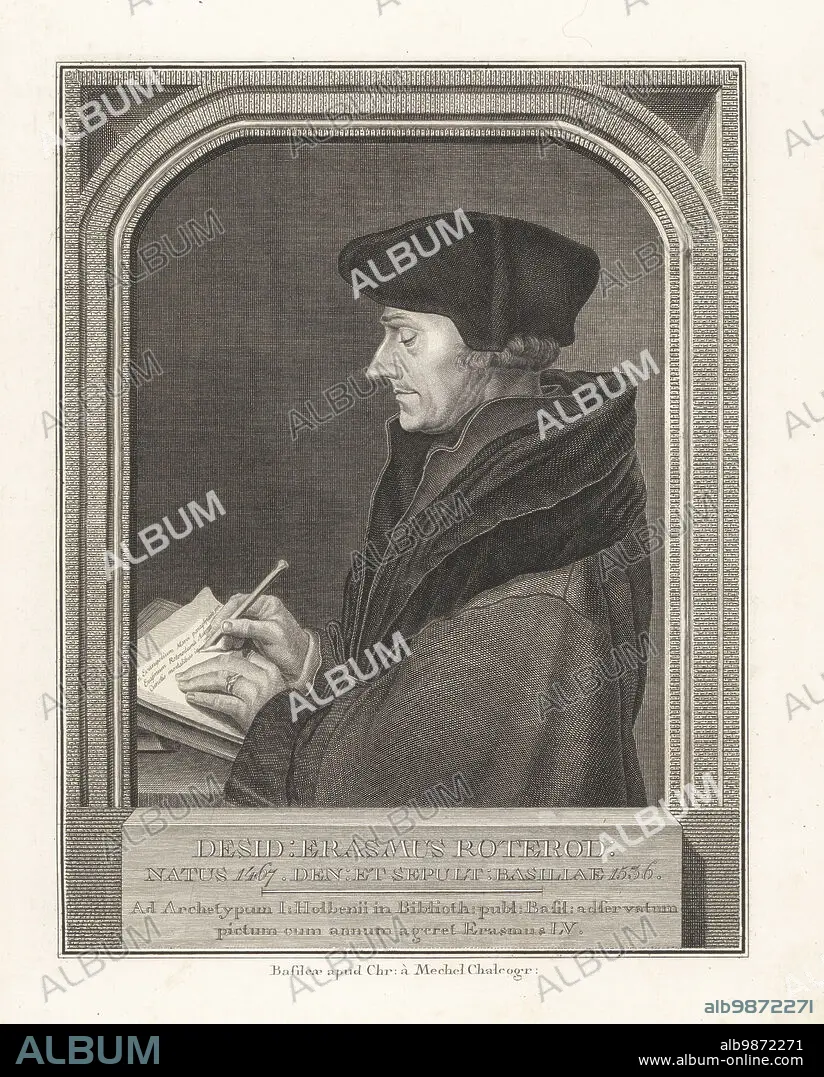 Caption: Portrait of Erasmus of Rotterdam, 1466-1536. Desiderius Erasmus Roterodamus, Dutch philosopher, humanist and Catholic theologian, considered one of the greatest scholars of the northern Renaissance. Desid: Erasmus Roterod: Copperplate engraving by Bartholomaus Hubner after a portrait by Hans Holbein in Christian von Mechel's Oeuvre de Jean Holbein, Chez Guillaume Haas, Basel, 1790.