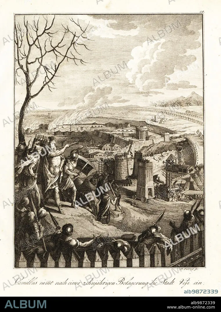 Roman general Marcus Furius Camillus destroying the Etruscan city of Veii or Velus after a decade-long siege in 396 BC. Soldiers use battering rams, siege engines, siege tower, ballista and ladders to storm the city. Camille se rend maitre de Veies que les Romains assiegeoient depuis dix ans. Copperplate engraving by Martin Pöltzel after a design by Gabriel de St. Aubin from Professor Joseph Rudolf Zappes Gemalde aus der romischen Geschichte, Pictures of Roman History, Joseph Schalbacher, Vienna, 1800. German edition of Abbe Claude Francois Xavier Millots Abrege de lHistoire Romaine.