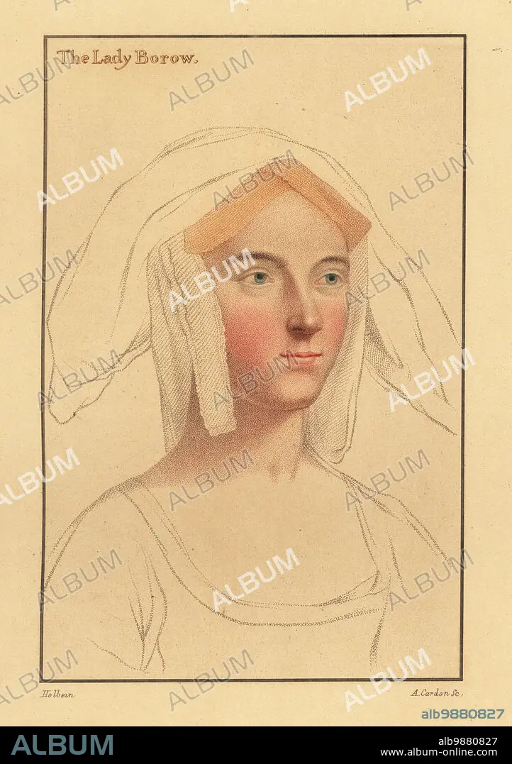 Caption: Alice London, second wife to Lord Thomas Burgh, courtier to Prince Edward. Or Catherine Clifton, later Lady Borough (Lady Borow), wife of William Lord Borough, second daughter of Edward Clifton, Earl of Lincoln. Or Catherine Parr, 1512-1548, Queen of England as last wife of KIng Henry VIII. Handcoloured copperplate stipple engraving by Anthony Cardon after a portrait by Hans Holbein the Younger from Imitations of Original Drawings by Hans Holbein, John Chamberlaine, London, 1812.