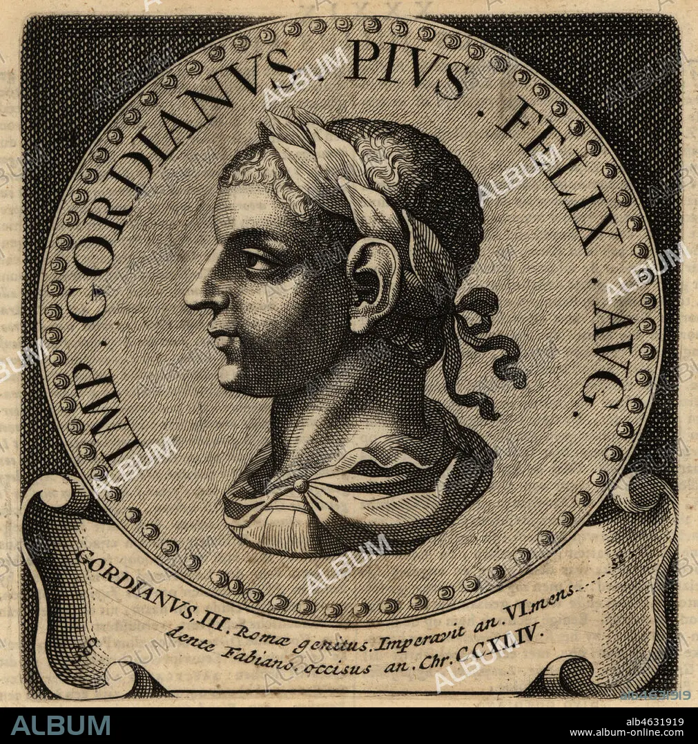 Caption: Roman Emperor Gordian III, 225-244. Marcus Antonius Gordianus Pius Augustus. Copperplate engraving from Abraham Bogaerts De Roomsche Monarchy, The Roman Monarchy, Francois Salma, Utrecht, 1697.