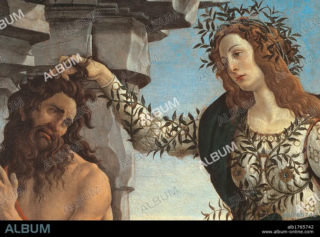 Caption: Italy, Tuscany, Florence, Uffizi Gallery. Detail. Woman crown entwined branches seize lock of hair Centaur hand arm face rinceaux man beard. Authorization required for non editorial use.
