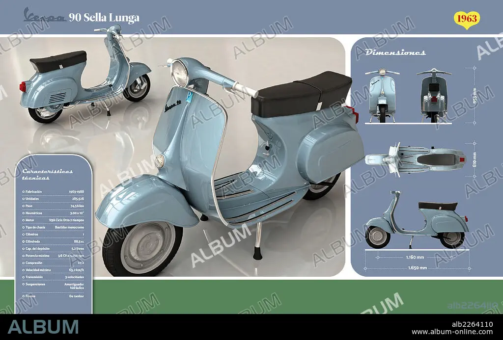 Infographics of the technical specifications and size of the 1963 Sella Lunga Vespa 90.