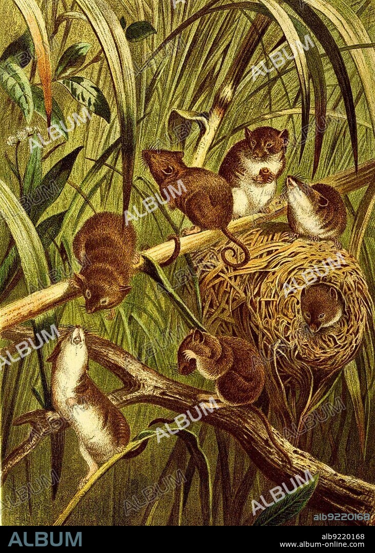 Caption: Dwarf mouse, also known as eurasian harvest mouse (Micromys minutus) to distinguish it from other dwarf mouse species, is a rodent species from the group of Old World mice, harvest mouse, is a small rodent native to Europe and Asia, Historic, digitally restored reproduction of an original from the 19th century, exact original date not known