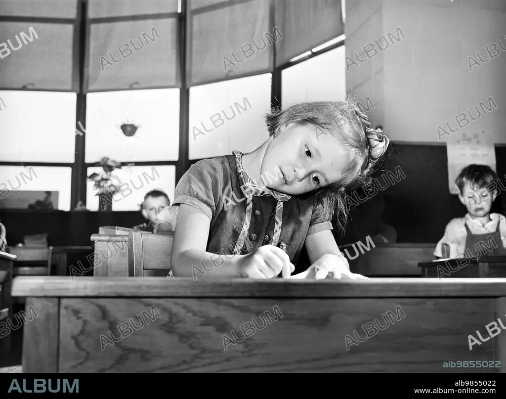 Young girl drawing picture at nursery school, Homestead school, Dailey, West Virginia, USA, Arthur Rothstein, U.S. Farm Security Administration, October 1941.