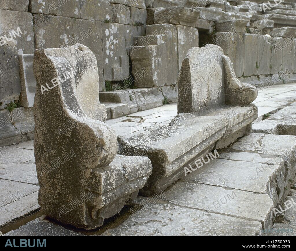 Turkey. Anatolia. Aspendos. Greco-Roman city. Theatre. Roman era. It was built by architect Zenon. 2nd century. Seats carved in marble (proedria) in Ima Cavea, reserved for the upper echelons of society.