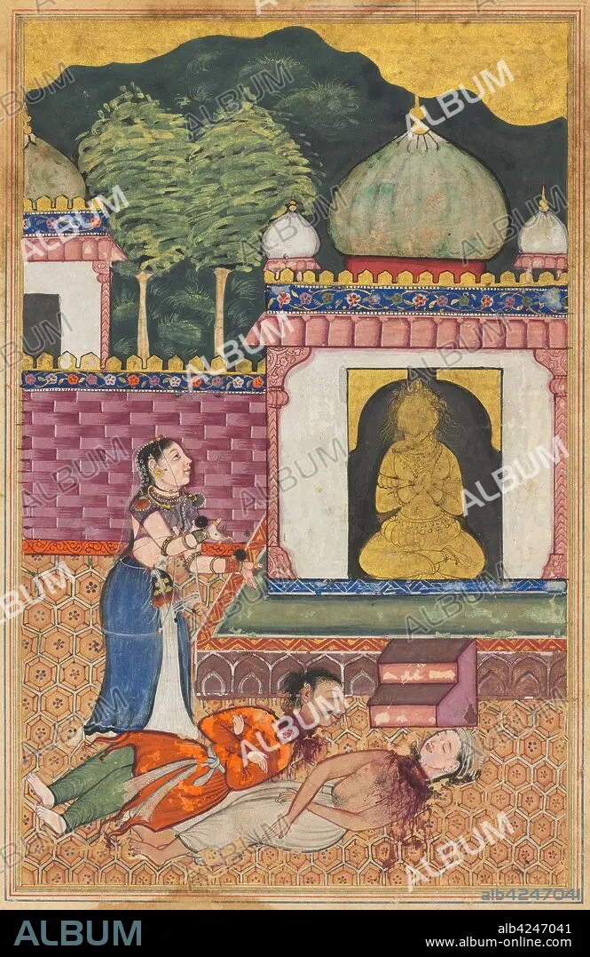 Caption: Page from Tales of a Parrot (Tuti-nama): Thirty-fourth night: The princess discovers the dead bodies, with heads severed, of her husband and his Brahmin friend, c. 1560. India, Mughal, Reign of Akbar, 16th century. Opaque watercolor and gold on paper;