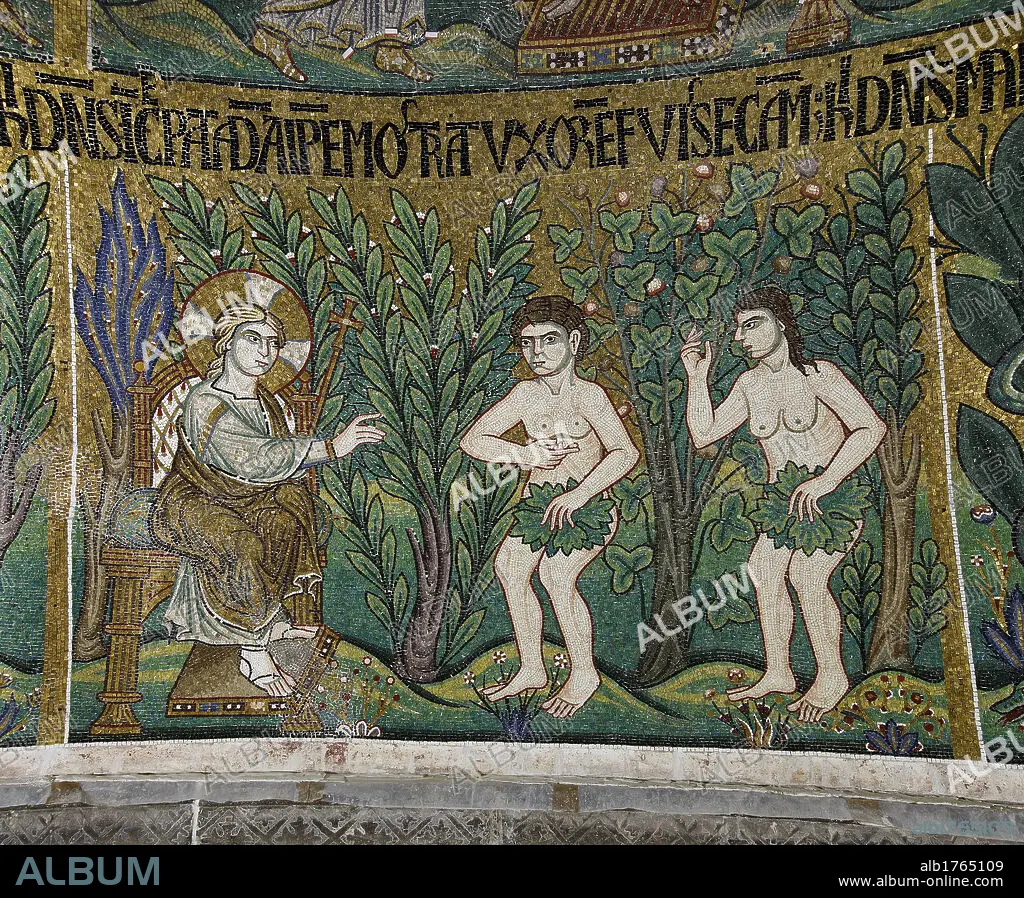 Caption: Italy, Veneto, Venice, San Marco Basilica. Detail. Dome of the Creation. The denial of guilt. God Father throne young man halo aureole haloed pastoral crosier staff cross Adam Eve nudity leaves lush nature plants trees leaves branches mosaics green blue pink gold Latin inscription, Photographic Campaign 2010.