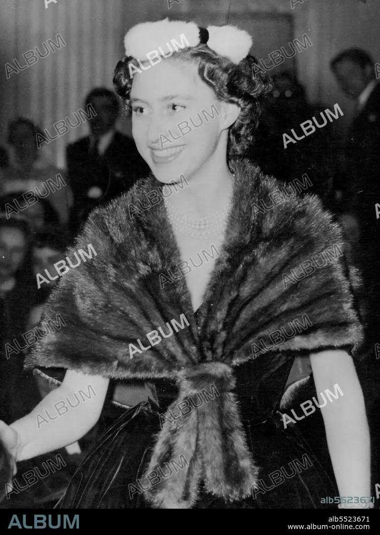 Caption: Princess Margaret At Dior Fashion Show in Palace - Princess Margaret is Obviously Enjoying herself at the presentation of Christian Dior's Paris Winter Collection held in Blenheim Palace, ***** Oxfordshire, this evening November 3. Her tiny velvet pill box hat is encircled with white ermine and her mink cape stole is worn over a black velvet dress with a bouffant skirt. About 1,600 guests paid five guineas each to attend the show, staged by 13 mannequins flown from Paris for the occasion.The palace was lent by the Duke and Duchess of Marlborough. November 03, 1954. (Photo by Associated Press Photo).