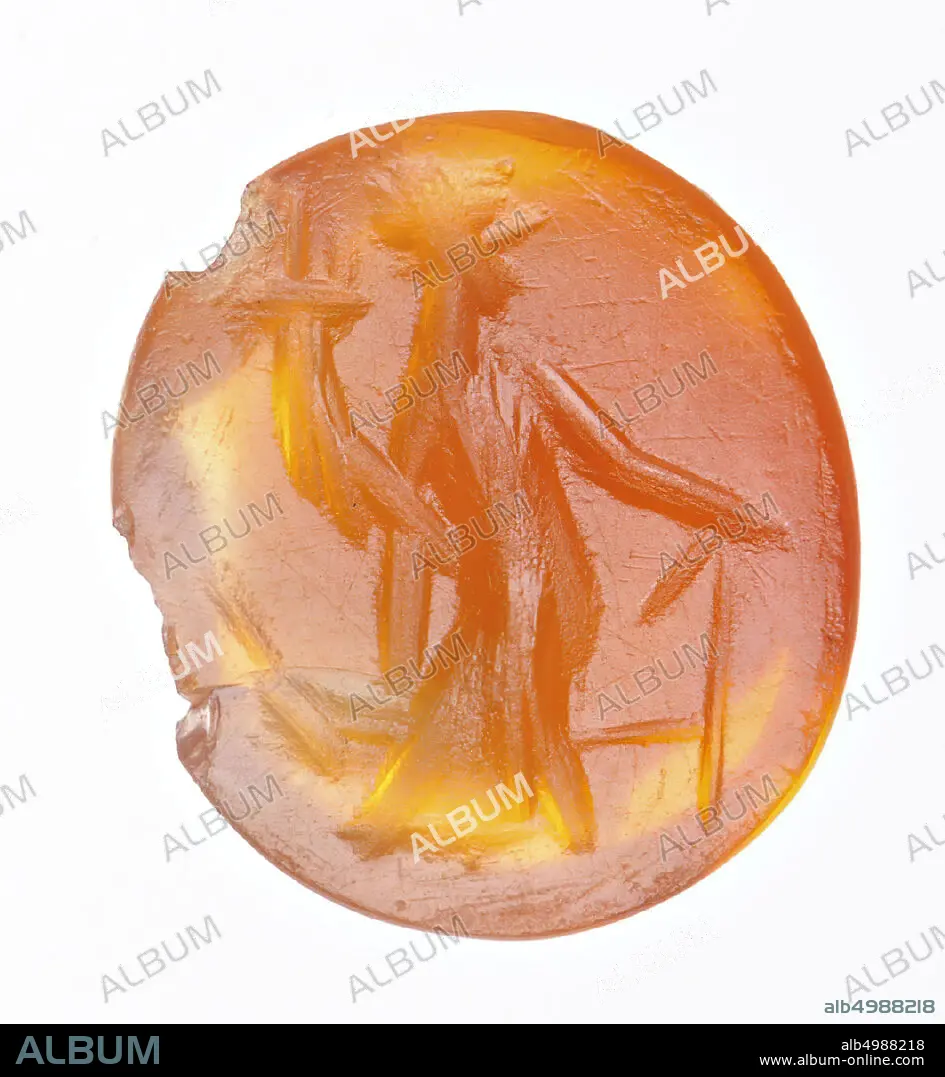 Caption: Fortuna with cornucopia in the right hand and supporting with the left hand on a rudder., Gem, intaglio, ringstone, stone, carnelian, Color: orange, transparent, Shape: oval, standing, Machined: Maaskant-Kleibrink, M. , Catalog of the engraved gems in the Royal Coin Cabinet, 1978, p.60, fig.2, type F1, 9 x 8 mm. Thickness 3 mm., 2nd - 3rd century after Chr. 100-300, Netherlands, Limburg, unknown, unknown