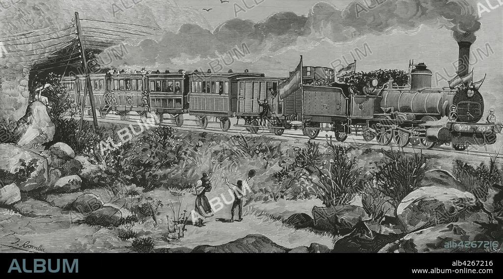Caption: Spain. King Alfonso XII (1857-1885) inaugurated the Madrid-Lisbon railway line on October 8, 1881. Inaugural train. Composition and illustration by Juan Comba. Engraving by Vela. La Ilustracion Espa–ola y Americana, 1881.