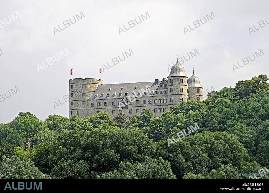 Caption: Overview, landscape, Wewelsburg, triangular castle, former Nazi cult and terror center of the SS, today historical museum, hostel, Bueren, Paderborn, North Rhine-Westphalia, Germany, Europe
