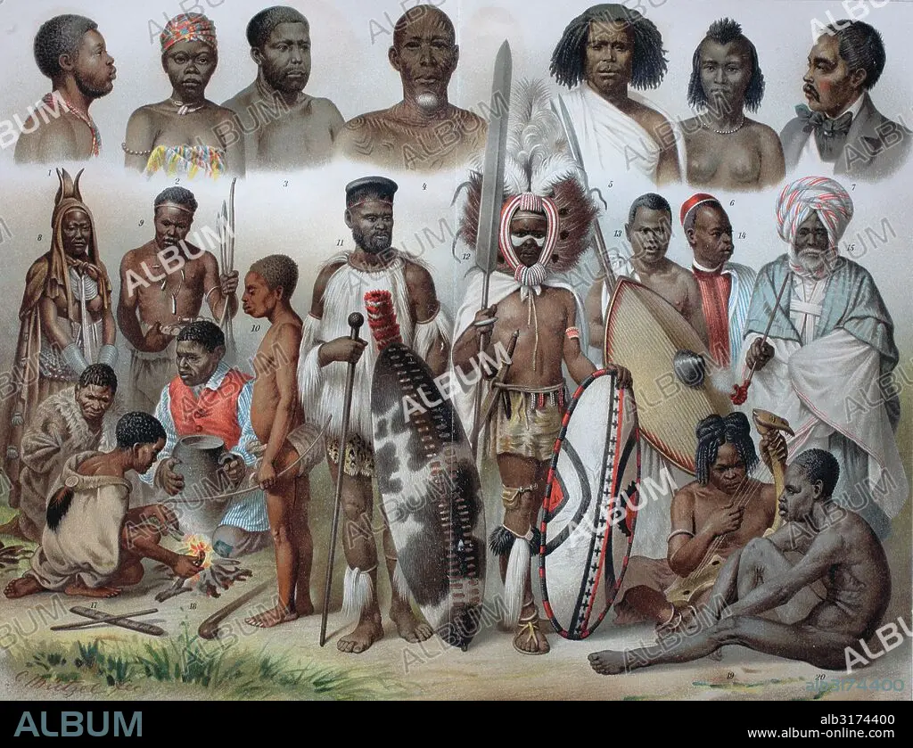 Caption: Ethnic groups of africa: 1 ashanti, 2 loango woman, 3 cameroon, 4 baluba, 5 somali, 6 abyssinian woman, 7 howa, 8 herero women, 9 ovambo, 10 akka, 11 zulu, 12 masai, 13 wagranda from uganda, 14 darfurian, 15 haussanian, 16 bushmen, 17 bushmen woman, 18 nama or namaqua, 19 niam, 20 dinka, historical illustration, wood engraving, circa 1888