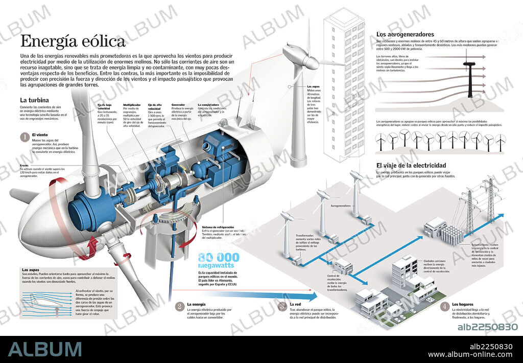 Infographic of the functioning of an aerogenerator (or wind turbine) and the process of transformation of eolic energy into electricity.