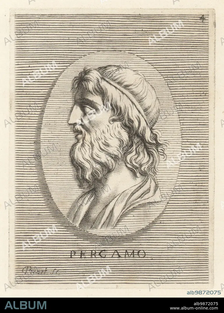 Caption: Pergamus, son of the warrior Neoptolemus and Andromache, mythical founder of the city of Pergamum. Depicted as an adult with long beard in an oval carnelian gem. Also identified as Hyacinthus, but the hair is not in the Laconian style. Pergamo. Copperplate engraving by Etienne Picart after Giovanni Angelo Canini from Iconografia, cioe disegni d'imagini de famosissimi monarchi, regi, filososi, poeti ed oratori dell' Antichita, Drawings of images of famous monarchs, kings, philosophers, poets and orators of Antiquity, Ignatio deLazari, Rome, 1699.