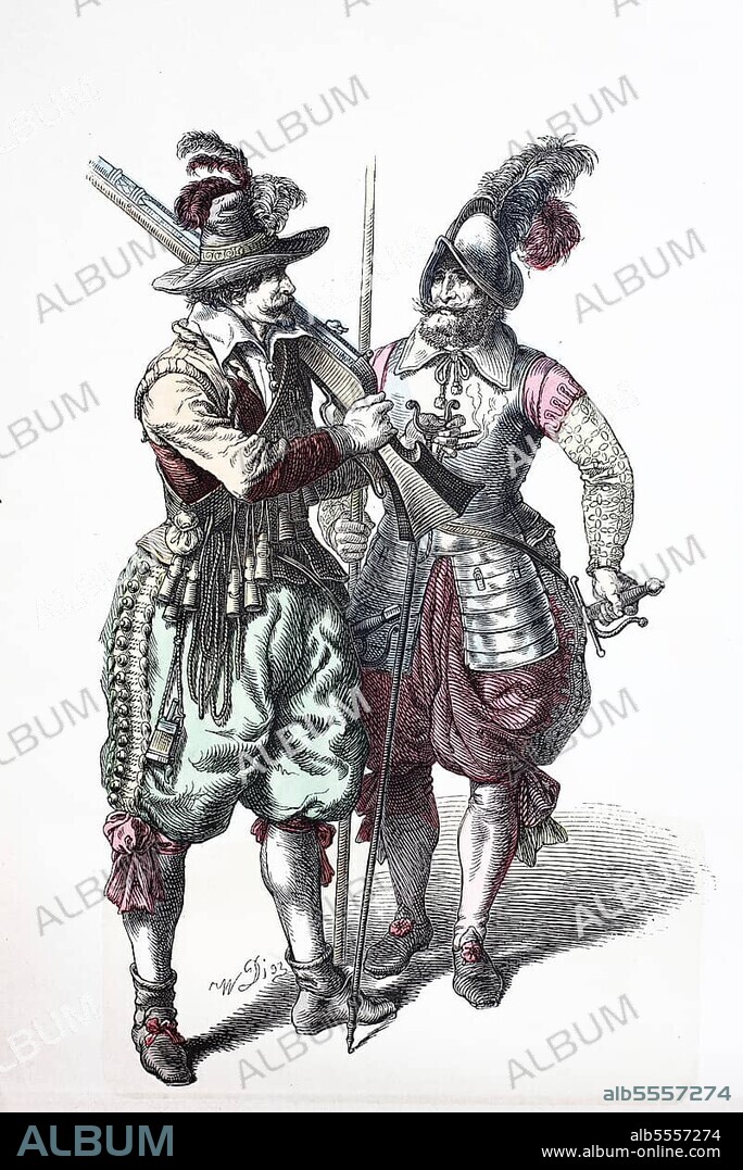 Caption: Folk Costume, Clothing, History of Costumes, Musketeer and Pikeman in the Thirty Years' War, 1670-1700, Germany, Historical, digitally restored reproduction of a 19th-century original, Europe