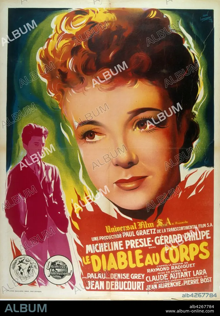 Poster for the French film, Devil in the Flesh (French: Le diable au corps) is a 1947 French movie directed by Claude Autant-Lara starring Micheline Presle and Gerard Philipe. It is based on a novel by Raymond Radiguet.