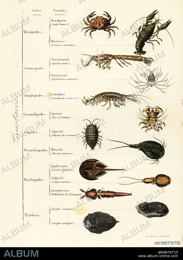 Caption: Orders of marine and terrestrial crustaceans. Floral egg crab, Atergatis floridus, European crayfish, Astacus astacus, mantis shrimp, Squilla mantis, freshwater shrimp, Atyaephyra desmaresti pill woodlouse, Armadillidium vulgare, fish louse, Argulus foliaceus, horseshoe crab, Limulus polyphemus, etc. Brachyures, crabe bronze, Macroures, ecrevisse commune, Unicuirasses, Squille mante, Bicuirasses, Phyllosome commun, Crevettines, Crevette des ruisseaux, Cyames, Poe de baleine, Cloporte des maisons, Monocle commun, Limule commun, Calige commun, Dichelestion de lEsturgeon, Asaphe cornigera, Asaphe caudigera. Handcoloured steel engraving printed by F. Chardon from Achille Comtes Musee dHistoire Naturelle, Museum of Natural History, Gustave Hazard, Paris, 1854.