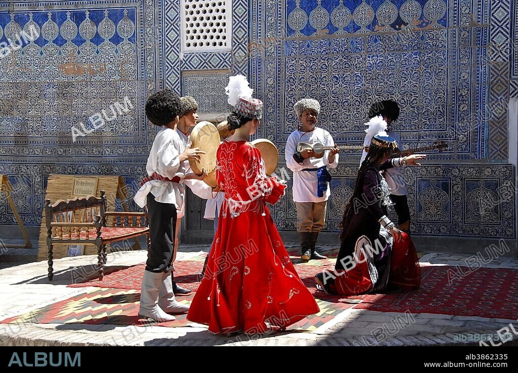 Traditional dance with clothes of Khwarezm Tash Hauli Palace Khiva Uzbekistan.