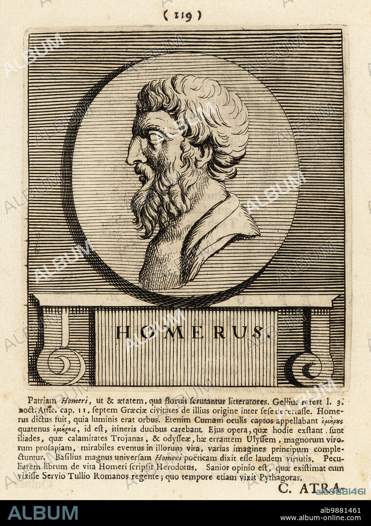 Homer, Greek poet, presumed author of the Iliad and the Odyssey, two epic poems that are the foundational works of ancient Greek literature. Homerus. Copperplate engraving by Pieter Bodart (1676-1712) from Henricus Spoors Deorum et Heroum, Virorum et Mulierum Illustrium Imagines Antiquae Illustatae, Gods and Heroes, Men and Women, Illustrated with Antique Images, Petrum, Amsterdam, 1715. First published as Favissæ utriusque antiquitatis tam Romanæ quam Græcæ in 1707. Henricus Spoor was a Dutch physician, classical scholar, poet and writer, fl. 1694-1716.