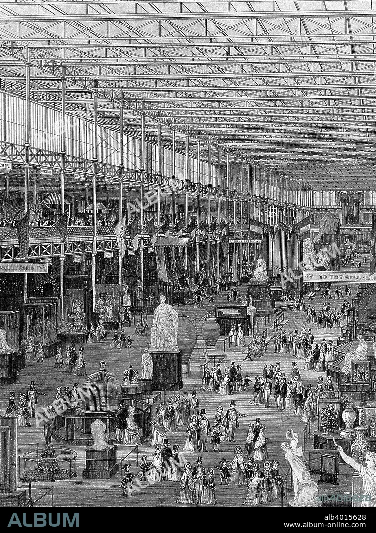 Great Exhibition in the Crystal Palace, Hyde Park, London, 1851. An interior view of the main avenue looking eastwards, showing galleries supported by iron columns rising to ridge-and-furrow glass roof. Conceived by Prince Albert, the Great Exhibition was intended to showcase the 'Works of the Industry of all Nations'. It was housed in the purpose-built Crystal Palace, the first large-scale prefabricated ferrovitreous (iron and glass) structure, designed by the gardener and architect Joseph Paxton. The prefabricated design made the construction, and later dismantling of the building, easier and quicker.