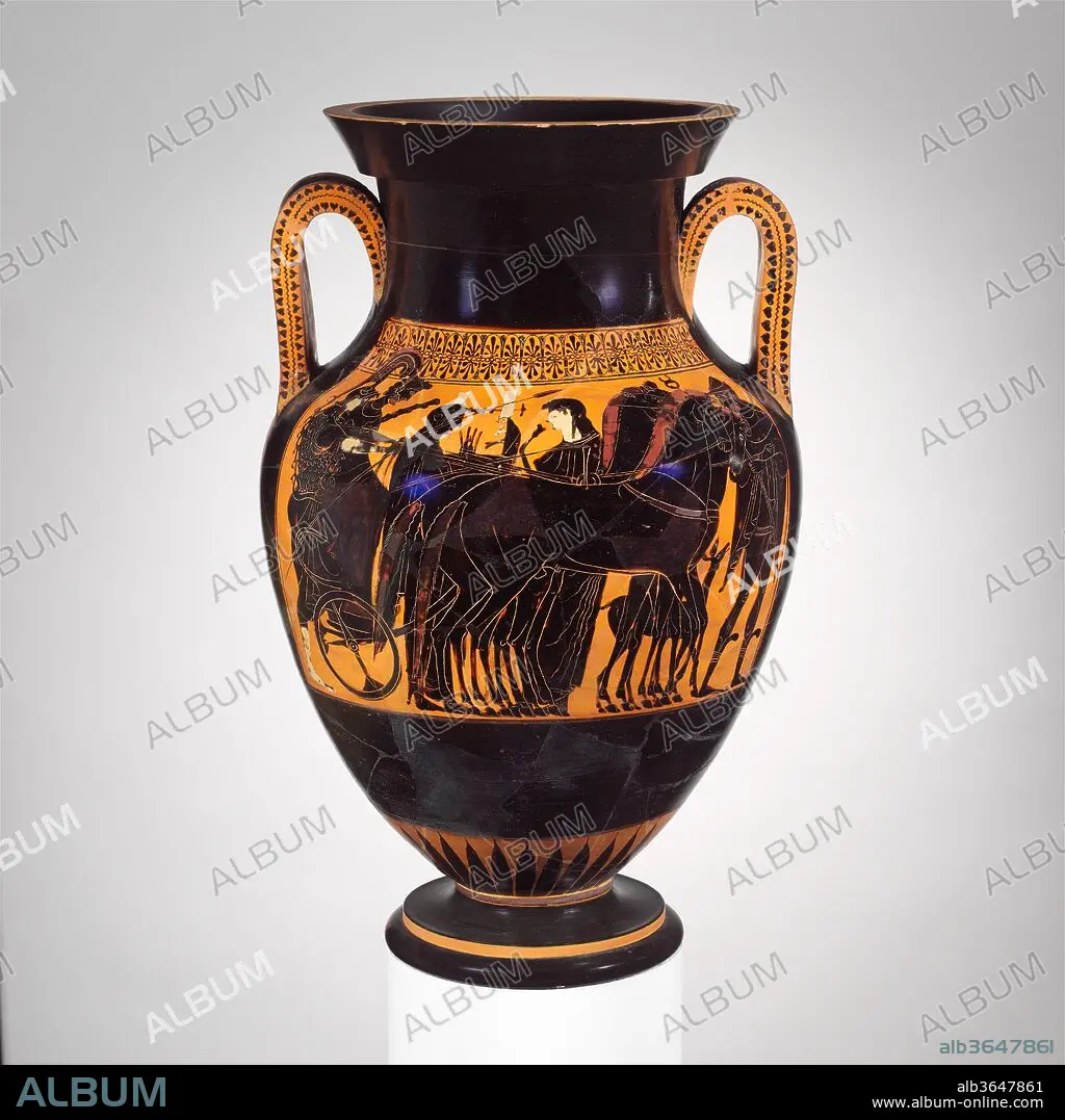 Caption: Terracotta amphora (jar). Culture: Greek, Attic. Dimensions: H. 23 1/4 in. (59.1 cm); diameter 14 5/8 in. (37.2 cm). Date: ca. 510 B.C..