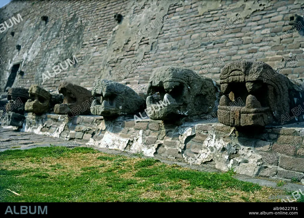 Caption: Tenayuca Pyramid, Aztec construction, the below part of the wall has snake heads surrounding the entire base of the structure. .