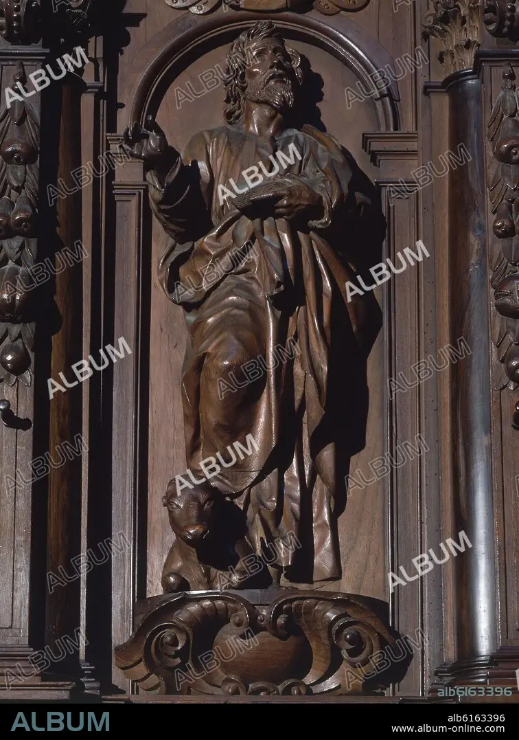 PEDRO DE MENA Y MEDRANO. SAN LUCAS - DETALLE DE LA SILLERIA DEL CORO DE LA CATEDRAL DE MALAGA - CAOBA - SIGLO XVII - BARROCO ESPAÑOL