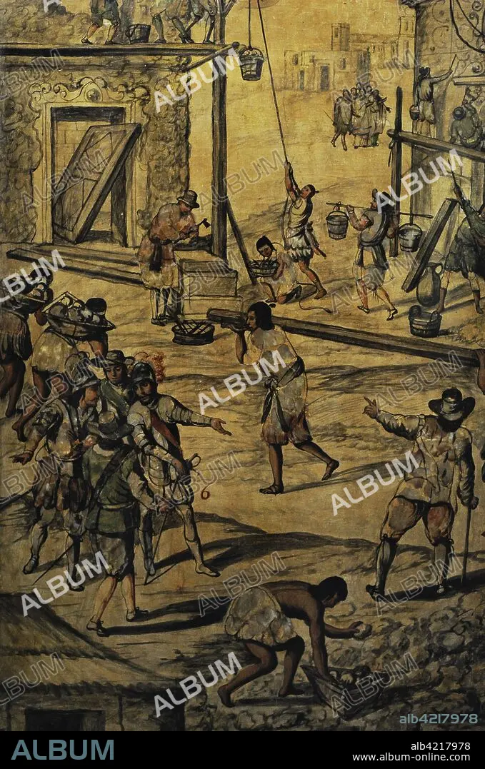 Spanish conquest of the Aztec Empire (1519-21). Construction of the Villa Rica of La Vera Cruz, with the help of the Totonac Indians. Detail. Board 3 belonging to a set of 24 boards made with the "enconchado" technique (fragments of mother-of-pearl embedded in the wooden surface, and soft layers of paint are added to the shiny surface). Painted by Juan and Miguel Gonzalez (active in the second half of the17th century). Reign of Charles II. Oil on panel and nacre. Viceroyalty of New Spain. Mexico, 1698. Museum of the Americas. Madrid, Spain.