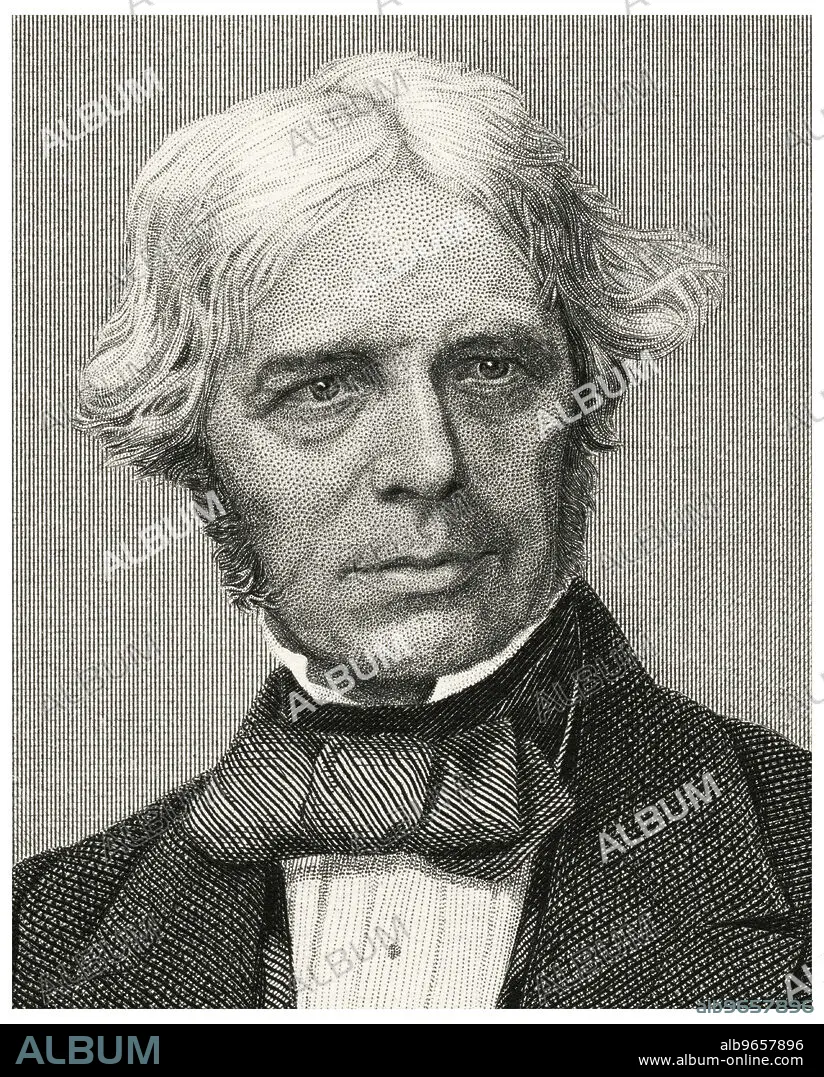 Caption: Michael Faraday (1791-1867), English Physicist and Chemist whose Experiments Contributed greatly to the Understanding of Electromagnetism, Head and Shoulders Portrait, Steel Engraving, Portrait Gallery of Eminent Men and Women of Europe and America by Evert A. Duyckinck, Published by Henry J. Johnson, Johnson, Wilson & Company, New York, 1873