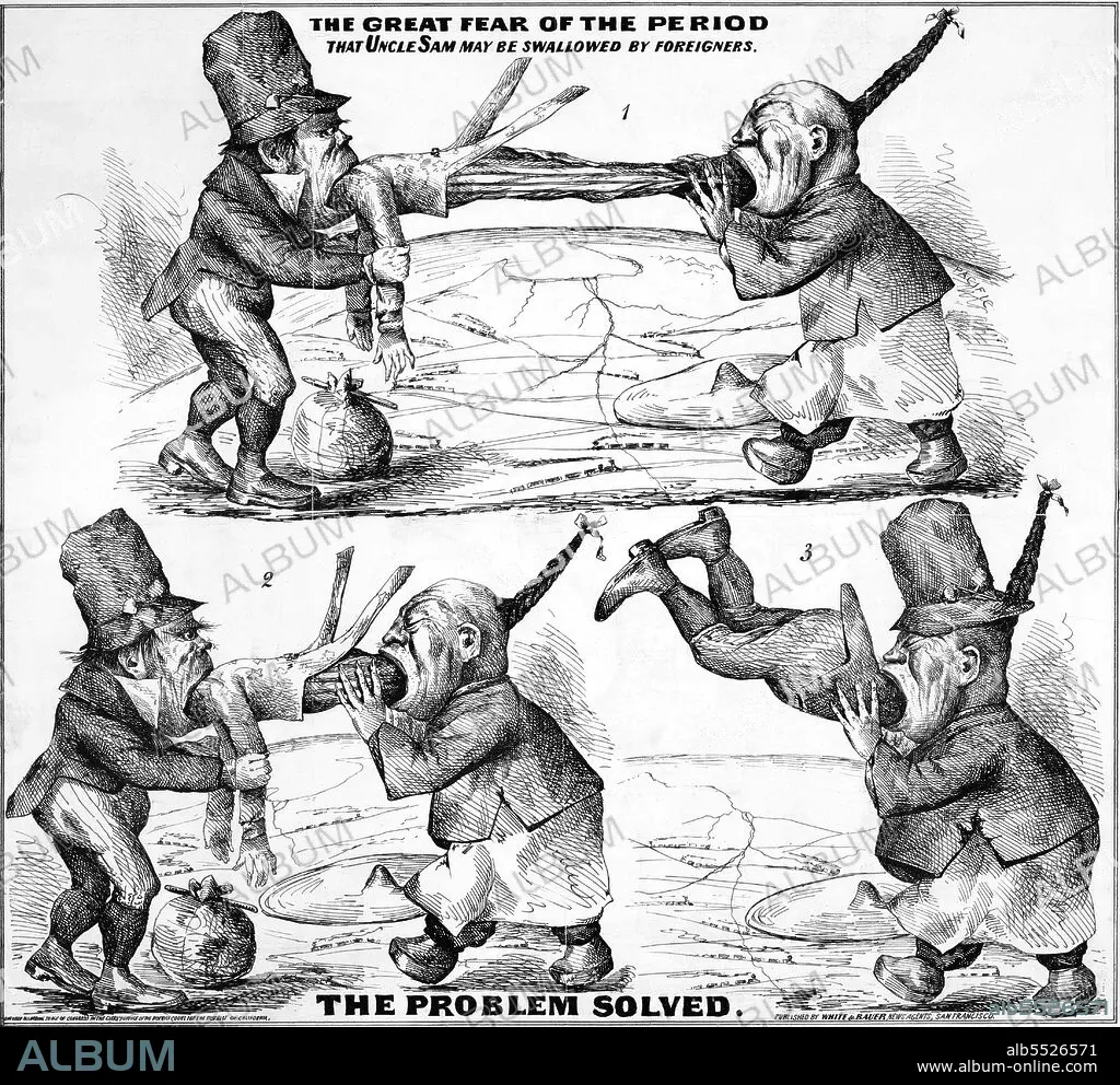 USA: 'The Great Fear of the Period—That Uncle Sam May be Swallowed by Foreigners'. Anti-Chinese, anti-Irish racist cartoon, San Francisco, White & Bauer Lithographers, late 1860s
