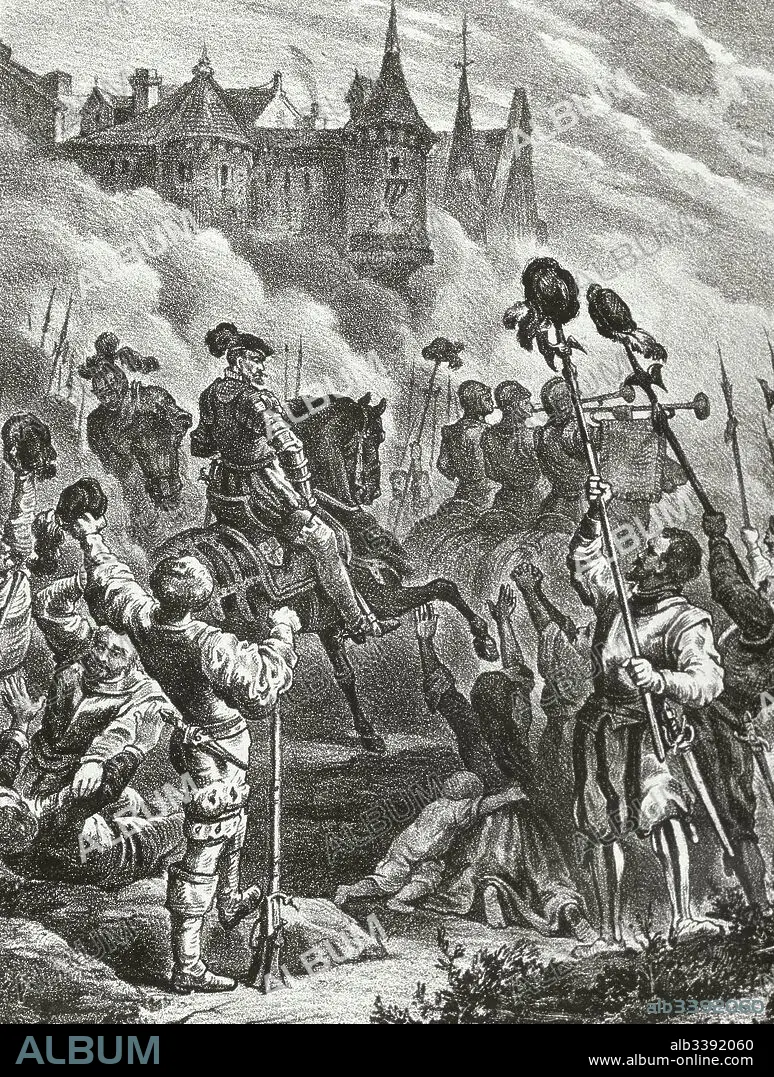 Caption: The Portuguese succession crisis of 1580. The fall of Lisbon. Fernando Alvarez de Toledo y Pimentel (1507-1582), 3rd Duke of Alba and supreme commander in Portugal in 1580, defeated Antonio I of Portugal in the Battle of Alcantara and reduced Portugal to the subjection of Philip II of Spain. Engraving.