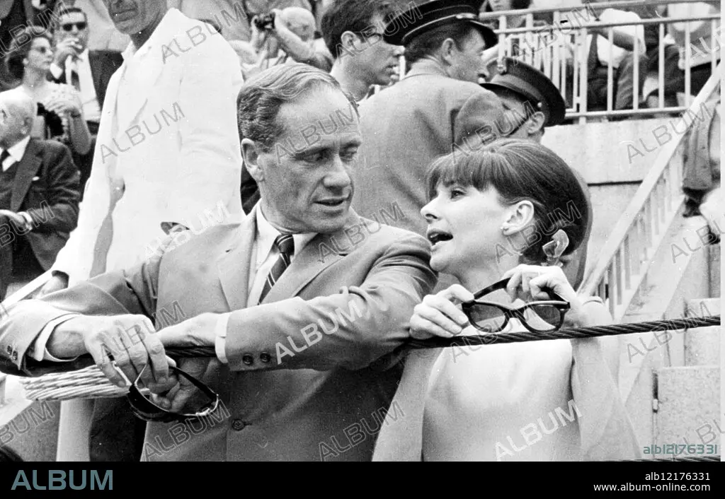 Madrid, Spain: husband and wife, Actress Audrey Hepburn and Actor Mel Ferrer discuss the afternoon's bullfighting as they were pictured during. A visit to the Monumental Stadium here on May 15 also in the crowd watching the afternoons bullfighting were Princess Grace and Prince Rainier of Monaco. 23 May 1964