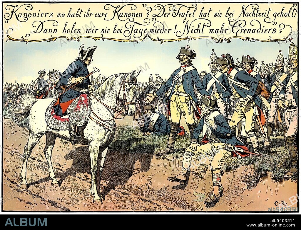 Caption: Battle of Hochkirch on 14 October 1758 in the Seven Years' War, attack of the Imperial Austrian army on the Prussian army camp near Bautzen, Frederick II or Frederick the Great, 1712 - 1786, King of Prussia and Elector of Brandenburg from the royal house of Hohenzollern, historical painting from the 19th century