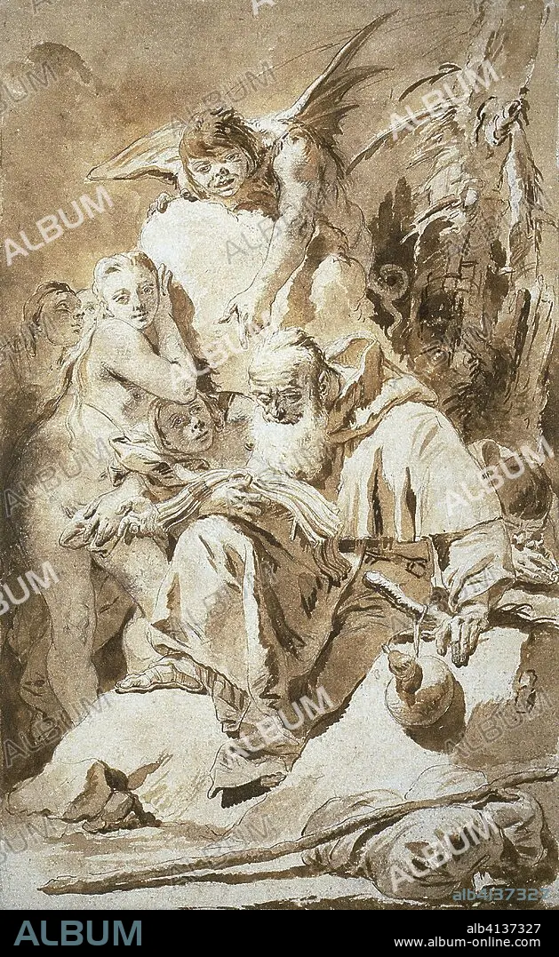 The Temptation of Saint Anthony. Giambattista Tiepolo; Italian, 1696-1770. Date: 1720-1734. Dimensions: 400 x 247 mm. Pen and brown ink and brush and brown wash, with black chalk and traces of charcoal, heightened with touches of white gouache, on ivory laid paper. Origin: Italy.