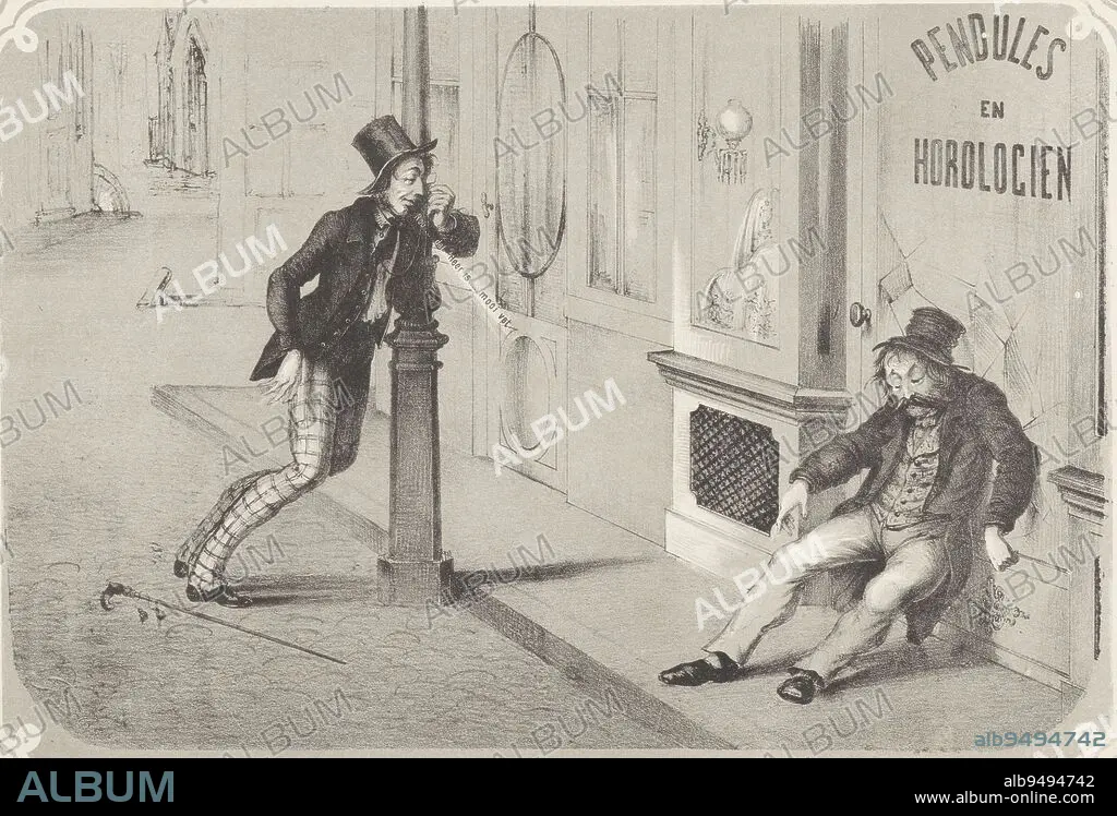 Caption: Two drunken men in the street, Gustaaf Leonardus Adolf Amand, 1867 - 1894, Representation of the proverb: the pot blames the kettle for being black. On the street, a drunken man has fallen against the façade of a store. Another drunken man leans against a lamppost and says, 'Well ... that Lord is ... pretty fat'. His walking stick is on the ground., print maker: Gustaaf Leonardus Adolf Amand, (mentioned on object), printer: Amand, (mentioned on object), Amsterdam, 1867 - 1894, paper, h 260 mm × w 352 mm