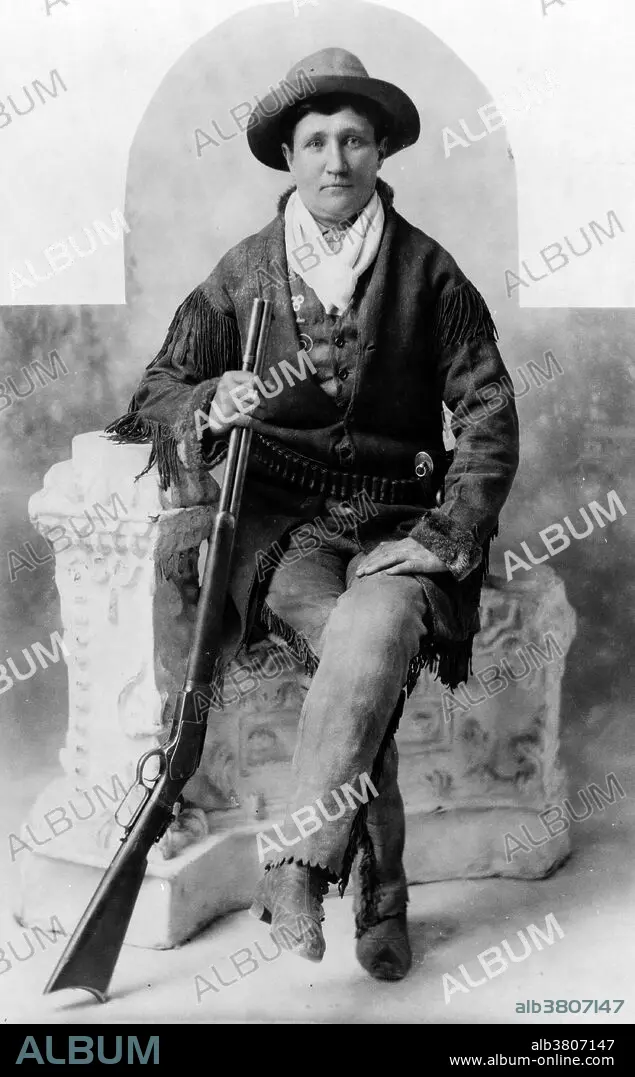 Calamity Jane with rifle as General Crook's scout, photographed by H.R. Locke, 1895. Martha Jane Canary (May 1, 1852 - August 1, 1903), better known as Calamity Jane, was an American frontierswoman and professional scout. She received little to no formal education and was illiterate. She worked as a dishwasher, a cook, a waitress, a dance-hall girl, a nurse, and an ox team driver. In 1874, she found work as a scout at Fort Russell. In 1876, she settled in the area of Deadwood and became friendly with Wild Bill Hickok and Charlie Utter. After Hickok's death she continued living in the Deadwood and in late 1876 or 1878, she nursed the victims of a smallpox epidemic. In 1881, she bought a ranch in Montana, along the Yellowstone River, where she kept an inn. In 1893, she started to appear in Buffalo Bill's Wild West as a storyteller. She also participated in the 1901 Pan-American Exposition. She returned to the Black Hills in the early spring of 1903. It was reported that she had been drinking heavily on board the train and became very sick to her stomach. She died soon afterward from inflammation of the bowels and pneumonia. She was buried at Mount Moriah Cemetery, South Dakota, next to Wild Bill Hickok.