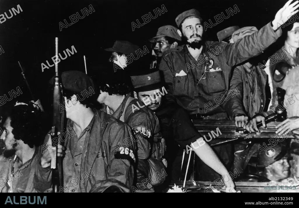 Title: Newly victorious fidel castro ruz entering havana at the head of his revolutionary army, cuba, 1959, juan almeida bosque is behind him in profile.