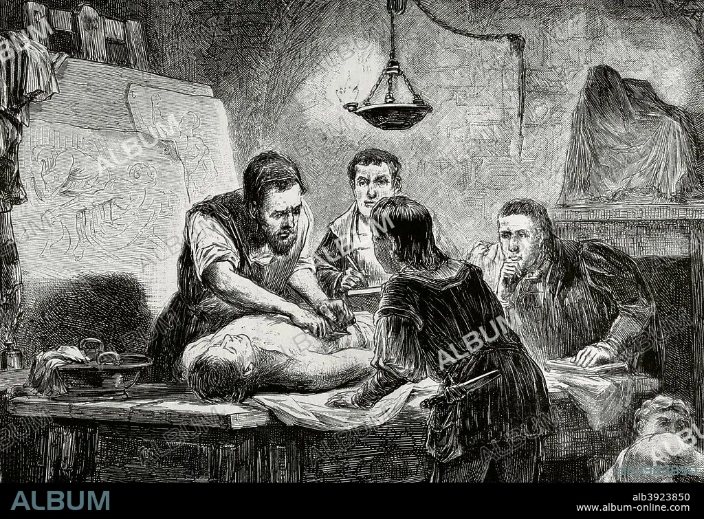 Caption: Michelangelo Buonarroti (1475-1564). Italian Renaissance artist. Michelangelo explaining anatomy to his disciples. Engraving after a composition of the baroque painter Georg Anton Urlab (1713-1759). Detail. La Ilustracion Espa–ola y Americana, September 15, 1876.