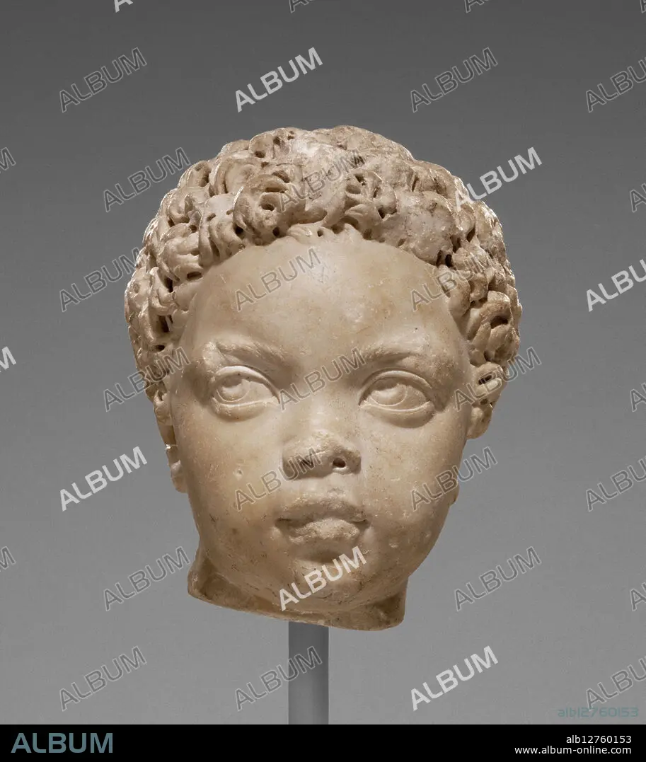 Portrait of a Child, A.D. 150-200. Additional Info: This child, probably a boy of early toddler age, is among the most sensitive portraits of very young children known in Roman art. Broken at the neck, the head would have sat on a full-length statue or a bust. Several features of this portrait are characteristic of Roman sculpture in the Antonine period (A.D. 138-192), such as the interest in observing personality, depicting movement, and contrasting textures such as the polished skin and the impressionistic rendering of the hair. The boy’s tight curls and some of his facial features have led some modern viewers to categorize him as a Black African, but given the lack of historical evidence (e.g., an inscription naming him) and non-physical markers of identity (such as clothing), the child’s ethnicity remains uncertain.
