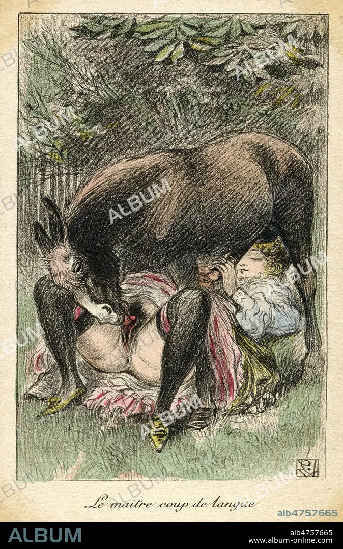 'Le maitre coup de langue' : un ane leche le sexe d'une femme qui le masturbe. Illustration zoophile pour une carte postale vers 1910. Credit : Collection IM/KHARBINE-TAPABOR.