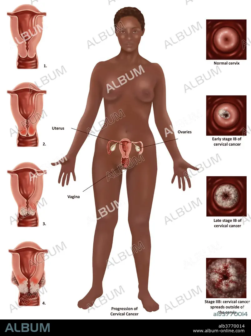 Caption: Illustration showing the progression of cervical cancer. Symptoms of cervical cancer include bleeding between periods, pain after sexual intercourse and heavier periods. Cancer of the cervix is rare and if detected early is almost always cured.