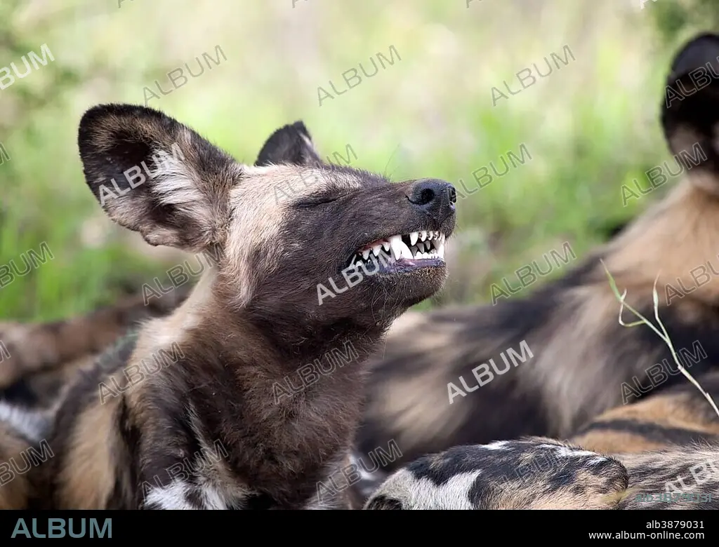 African wild dog or African painted dog (Lycaon pictus) baring teeth, Kruger National Park, South Africa