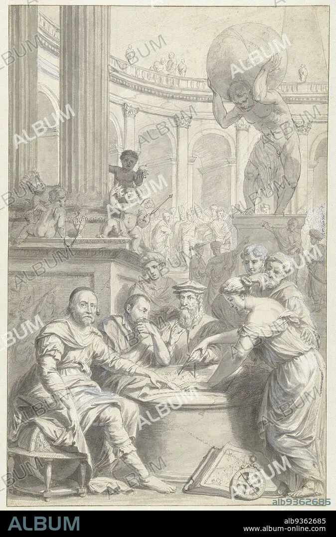 Caption: Title Page Design for Johannes Janssonius van Waesberge, Atlas Contractus, Design for title page of an atlas depicting the geographers Johannes Janssonius, Jodocus Hondius and Gerard Mercator sitting around a table., draughtsman: Zacharias Webber (II), 1661 - 1666, paper, deck paint, brush, pen, height 411 mm × width 263 mm