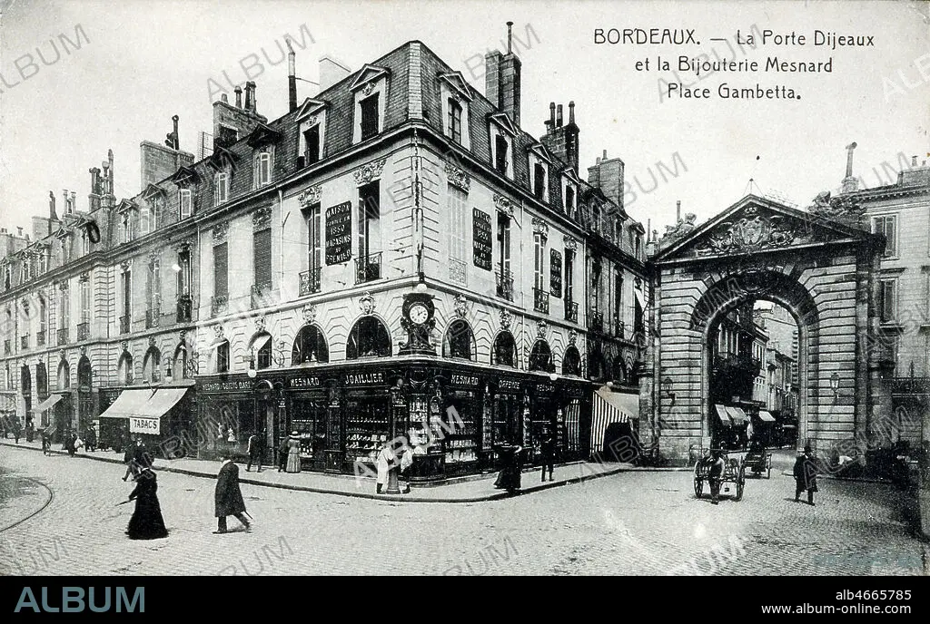 'Bordeaux - La porte Dijeaux et la bijouterie Mesnard. Place Gambetta'. Carte postale editee vers 1910-1915. Credit : Collection IM/KHARBINE-TAPABOR.